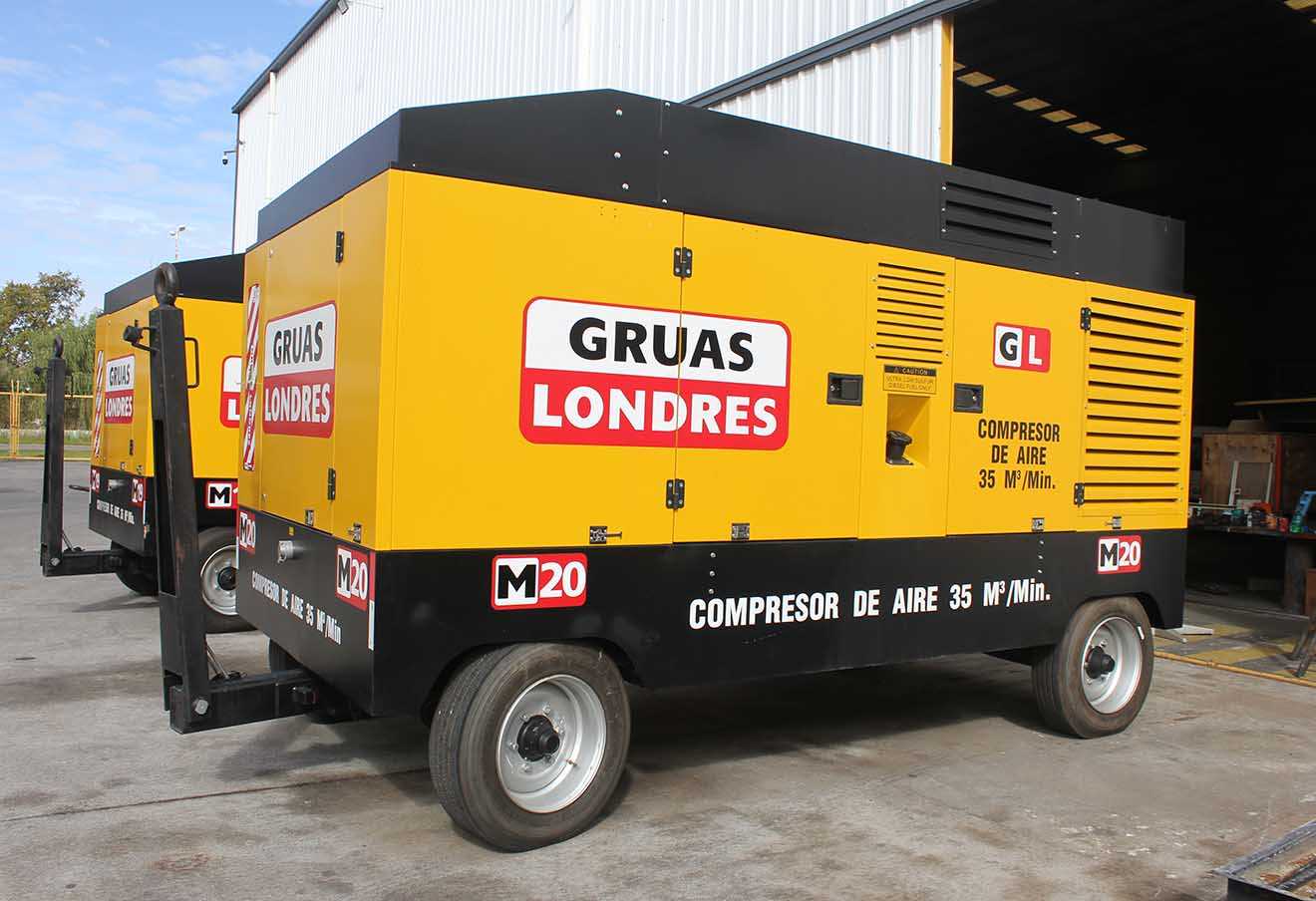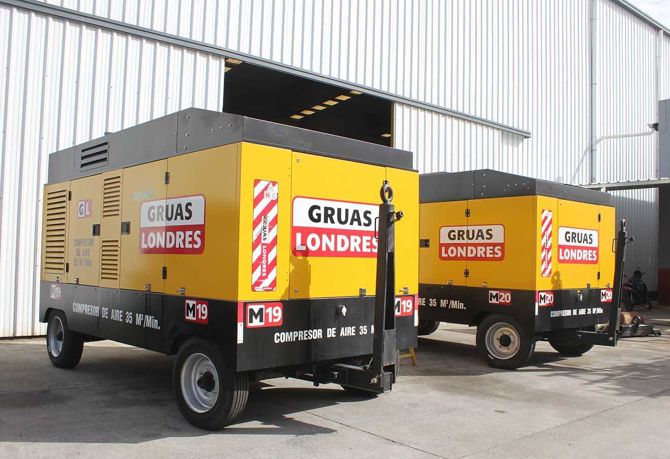 Alquiler de Compresores de aire de 10 a 45 m3/min Compresores portátiles para suministro de aire a presión Montados sobre tráiler y transportables con camiones de Grúas Londres hasta el sitio de trabajo. Abastecimiento de combustible con acoplados-tanque.